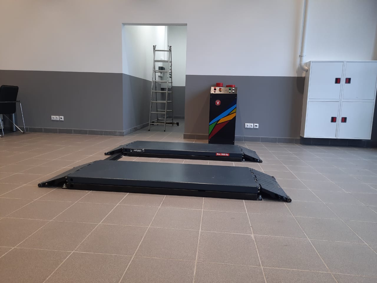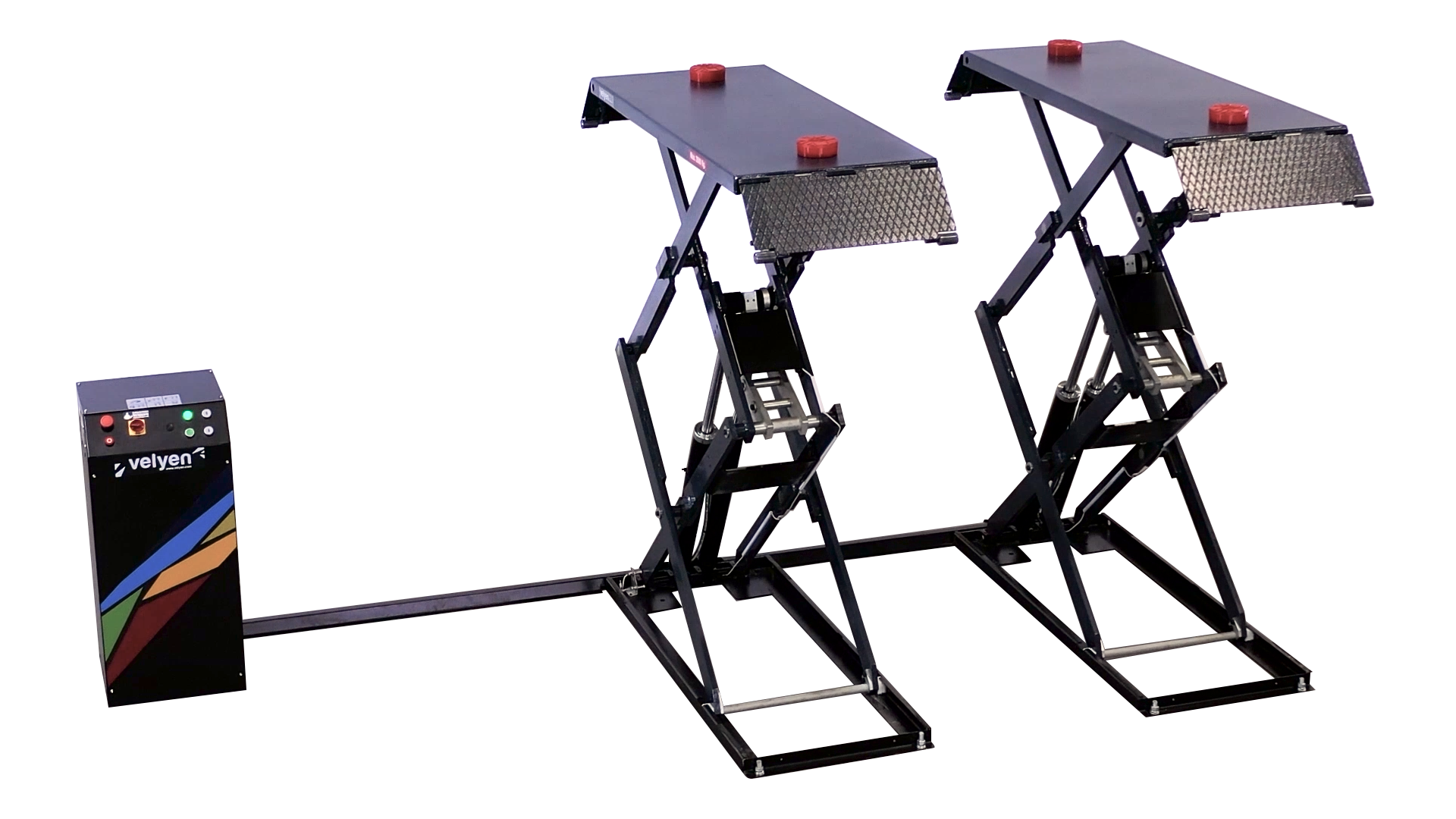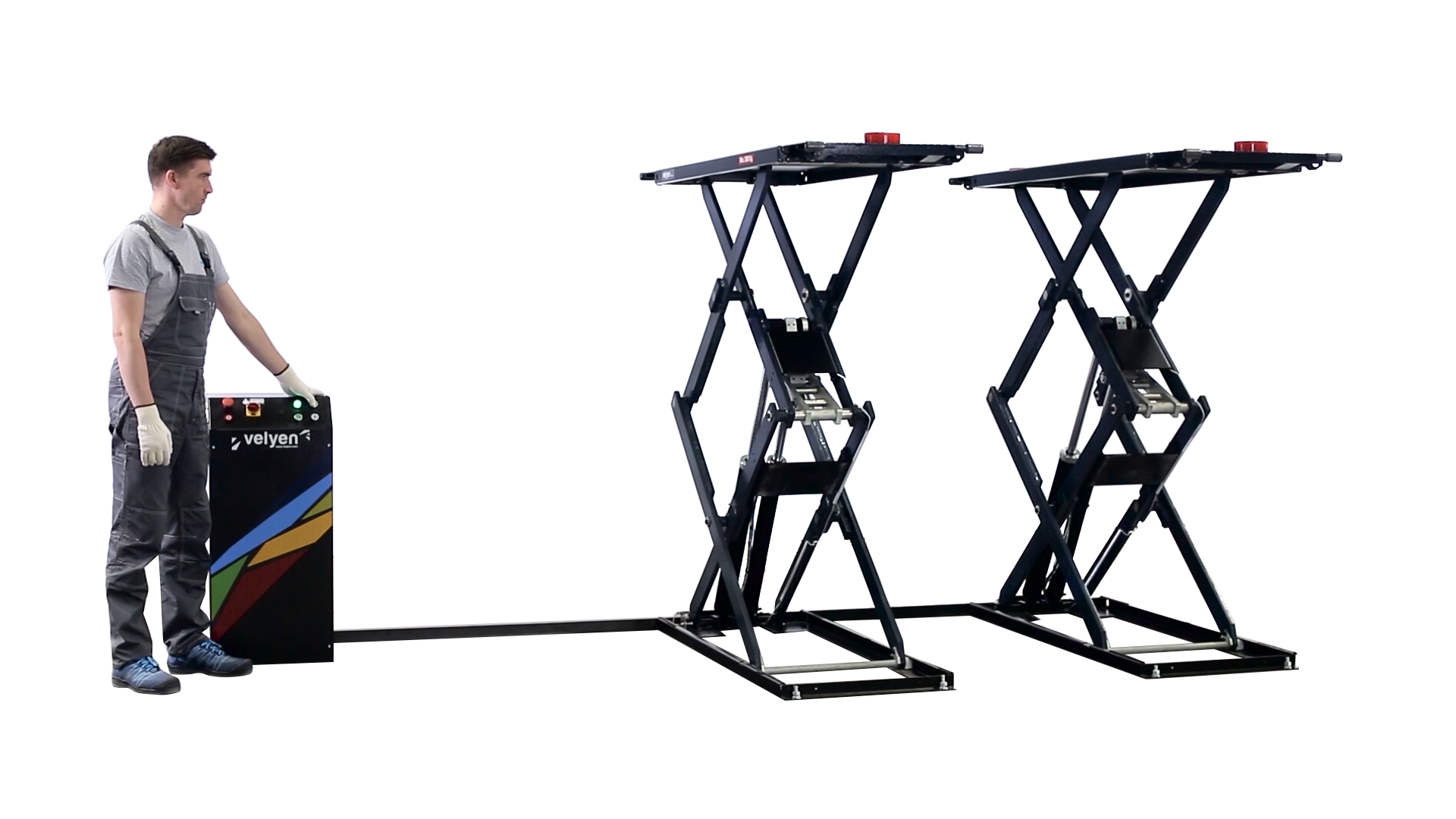 Гидравлический ножничный подъемник Velyen, модель4EE0300с короткими платформами грузоподъемностью 3500 кг является универсальным и подходит как для напольной установки, так и для установки вровень с полом и предназначен для обслуживания легковых автомобилей, внедорожников и легкого коммерческого транспорта. Длина платформ вместе с заездными трапами составляет 2067 мм. Четыре гидравлических цилиндра обеспечивают синхронизацию платформ, а также их фиксацию в поднятом состоянии. Минимальная высота в сложенном состоянии составляет 110 мм и позволяет обслуживать автомобили с низким клиренсом, а максимальная высота подъема 1930 мм обеспечивает максимальное удобство при работе. Удобная конструкция обеспечивает легкий доступ практически к любым узлам и агрегатам автомобилей.