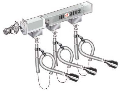Рельсы сделаны из алюминиевого сплава, что гарантирует легкость конструкции и сопротивление воздействиям химических компонентов, содержавшим в выхлопном газе. Рельсы, с поддержкой заранее смонтированными кронштейнами из углеродистой стали, позволяет создание очень длинных всасывающих линий, стойких к скручиванию под нагрузкой. Система обеспечивает прекрасную внутреннюю вакуумную изоляцию, благодаря специальной резиновой изоляции стойкая к агрессивным компонентам выхлопного газа, высокой температуре, старению и трению. Установка конструкции очень упрощена с помощью большого диапазона телескопических кронштейнов, которые могут использоваться для установки также в на существенных высотах Рекомендуется исключительно для автомобильных сервисов в ситуациях, в которых система может быть одновременно использована на 2-х параллельно стоящих постах.