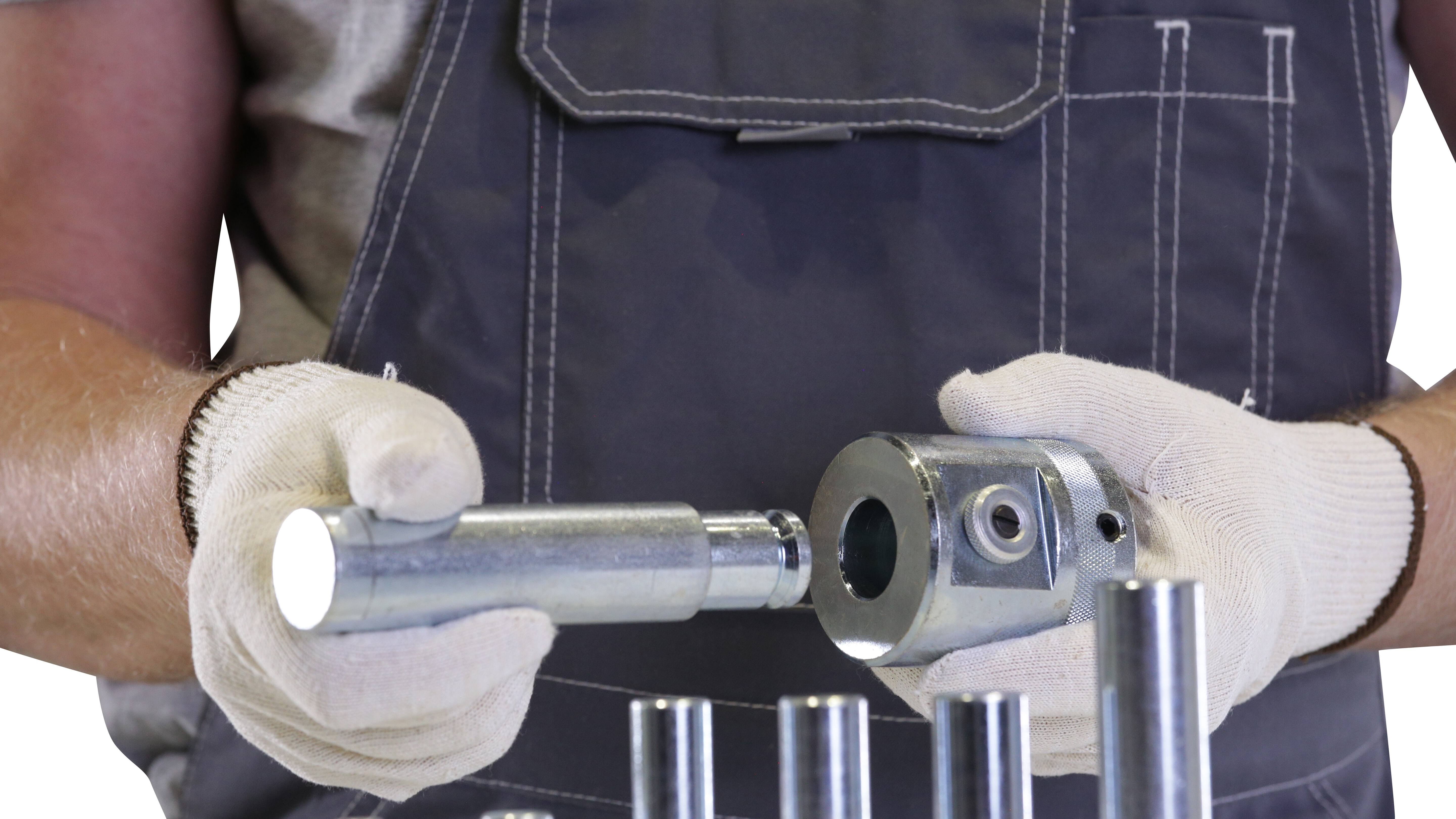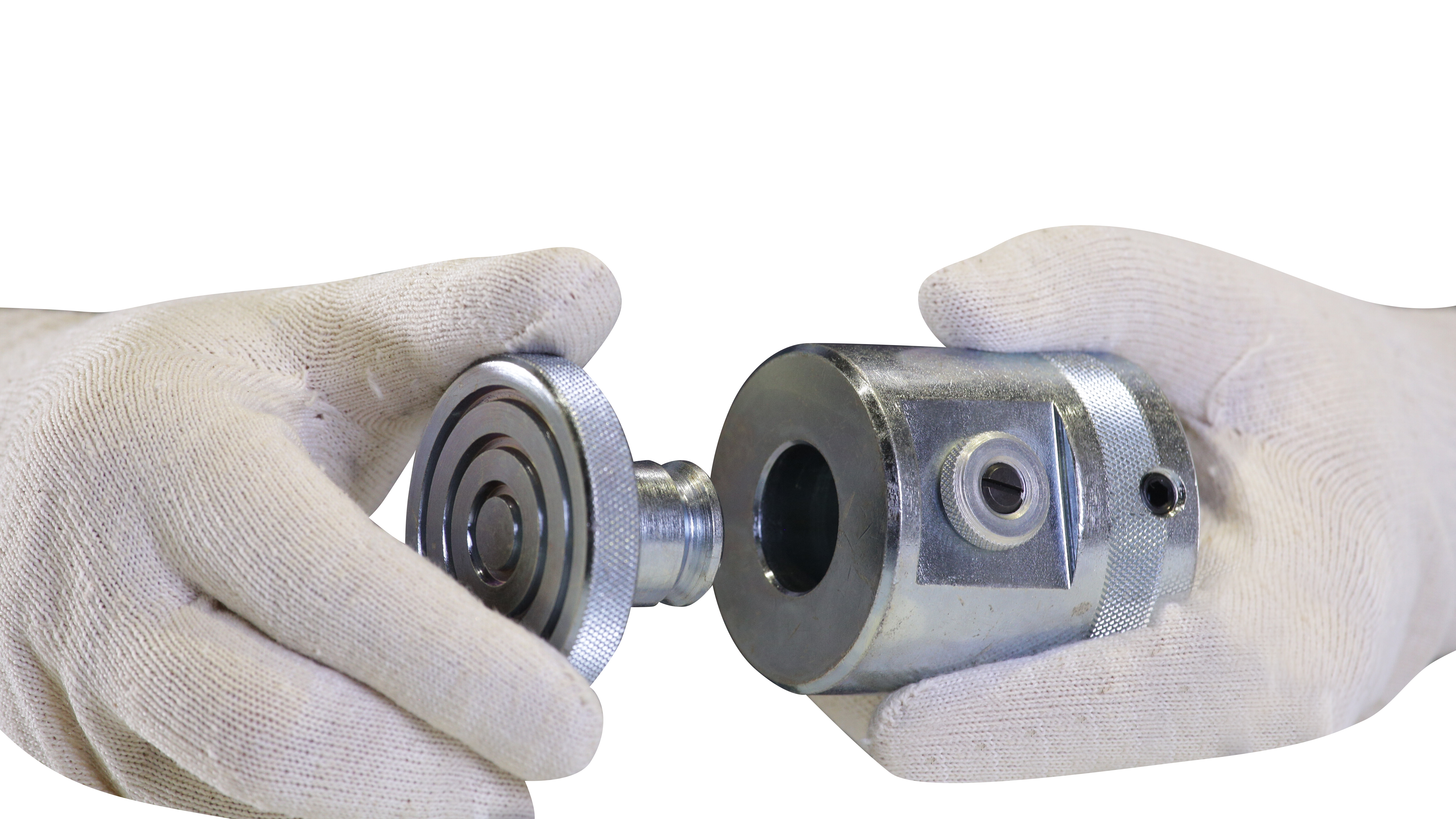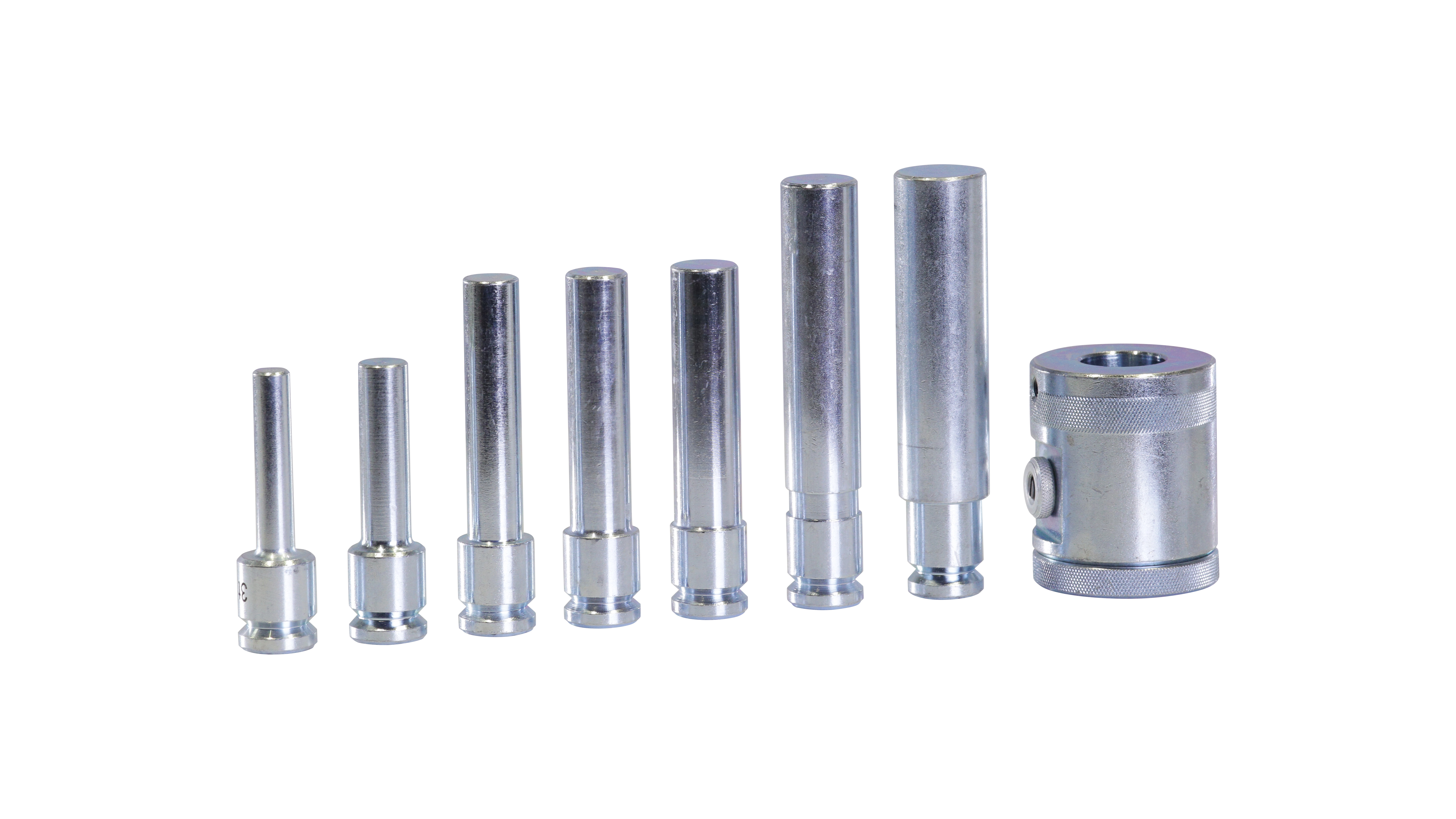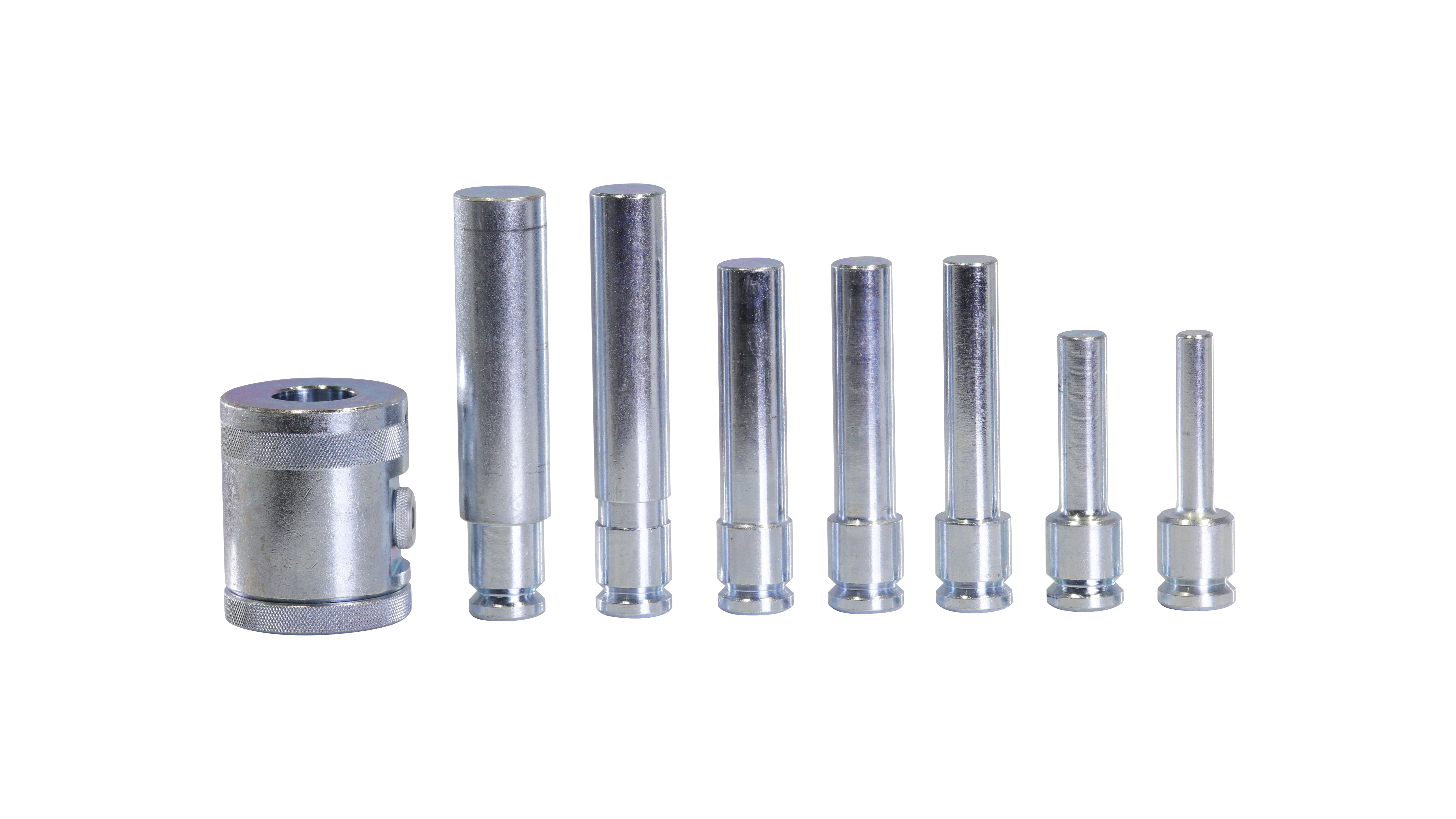 При работе с гидравлическим прессом часто возникают ситуации, когда необходимо выпрессовать или запрессовать деталь большего или меньшего диаметра, чем шток гидроцилиндра. Если в случае большего диаметра, все решается подбором оправы подходящего размера, то для работы с деталями меньшего размера оптимальными решением будет использование комплекта пуансонов различного диаметра.Комплект A-5600 состоит из 7 пуансонов диаметром 12, 16, 18, 20, 22, 25, 30 мм. Для фиксации пуансона в штоке гидроцилиндра, его достаточно просто вставить во внутреннюю полость штока, предварительно сняв защитную заглушку. За счет шарикового механизма пуансон надежно фиксируется и не выпадает в процессе эксплуатации. Для хранения комплекта, в конструкции прессов MEGA предусмотрена встроенная полка.