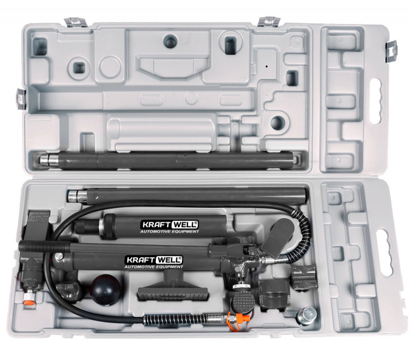 При проведении кузовного ремонта часто требуется выправить небольшие вмятины, не прибегая к помощи стапеля или аппарата точечной сварки. Лучшим решением в данном случае станет применение набора гидравлических растяжек KRWPH10 или, как его еще называют, рихтовочный комплект. Входящие в комплект насадки различной формы справятся с любым типом вмятин, а удлинители гидравлического цилиндра позволят без труда подобрать необходимую длину для доступа к точке, где требуется правка. Гидравлический насос развивает усилие 10 тонн, которого хватает, чтобы справиться с самыми сложными вмятинами. Комплект поставляется в удобном пластиковом кейсе. Все элементы изготовлены из высококачественных материалов.Техническое оснащение комплекта KRWPH10: