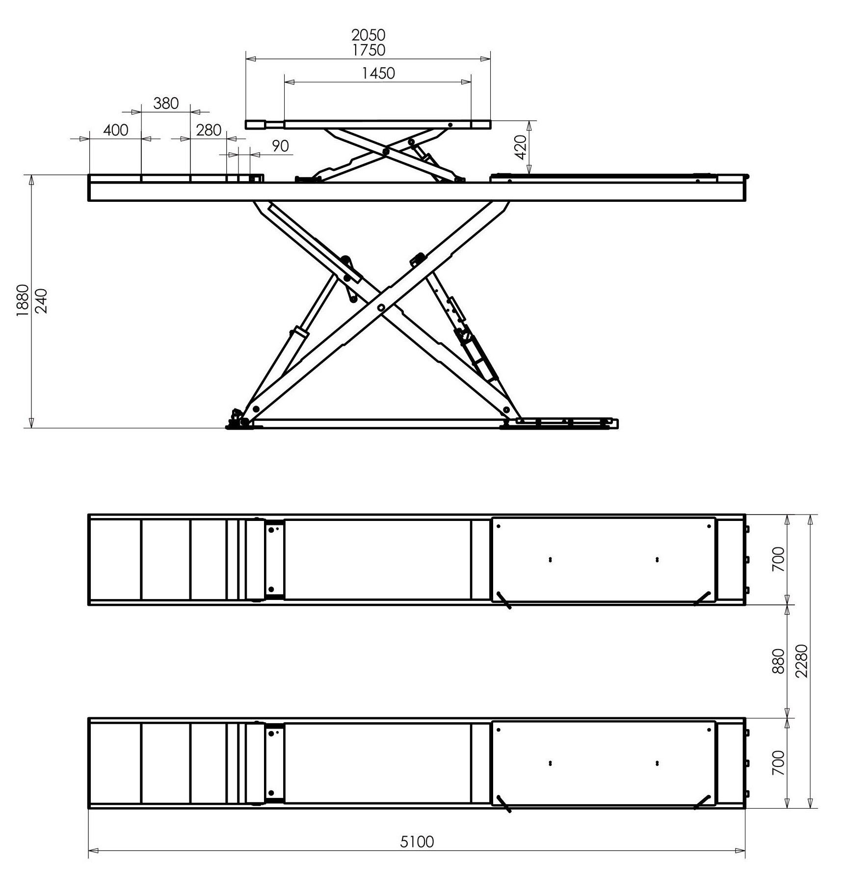 Описание: Подъемник ножничный, электрогидравлический, г/п 5500 кг., 2,2 кВт, высота подъема 1880 мм., размеры платформ 5100х700 мм, расстояние между платформами 800 мм, платформы - для сход-развала.