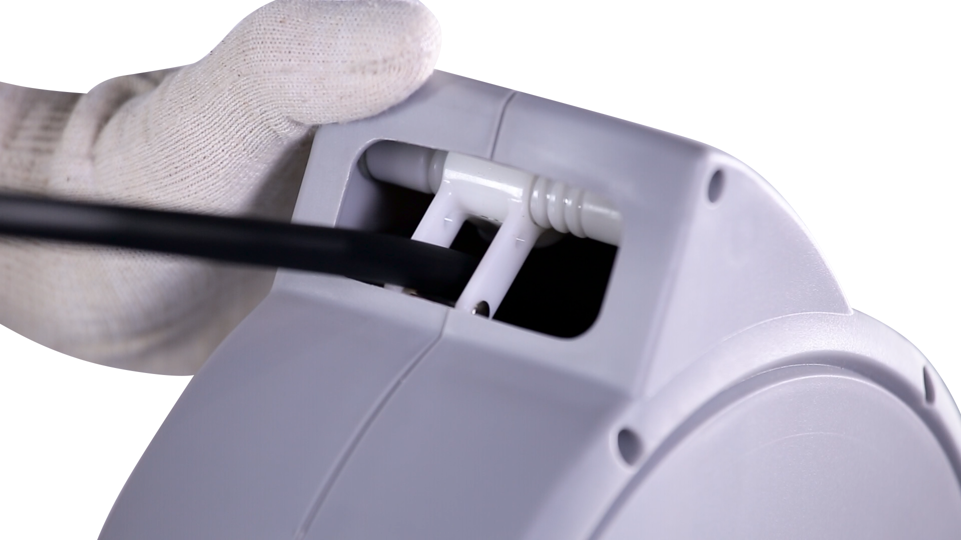 Компактные габариты корпуса катушки позволяют установить ее в любом удобном месте. Чаще всего монтаж проводится на стенах или колоннах здания. Благодаря поворотному кронштейну катушка может поворачиваться на 180 градусов. Неподвижная часть шланга, через которую воздух или вода попадают в катушку, имеет длину не более 1 метра и подключается к трубопроводу сжатого воздуха или воды. Подвижная часть шланга, выходящая из катушки, подключается к пневмоинструменту и может вытягиваться на необходимую длину и фиксироваться в таком положении. За счет регулируемой длины шланга, он, в отличие от обычных шлангов, не мешается при работе, а ограничитель сматывания не дает шлангу полностью смотаться в корпус после окончания работы.