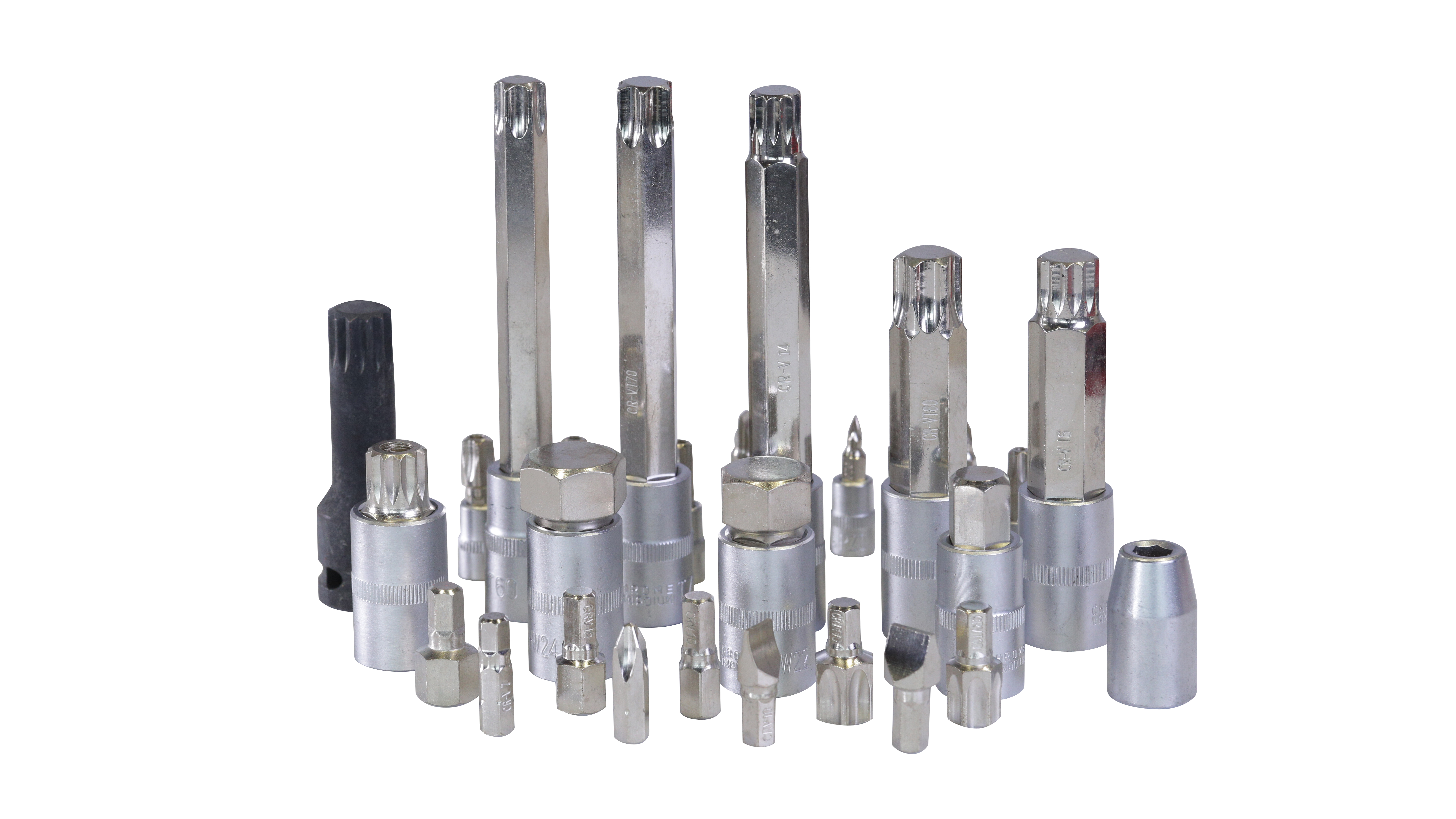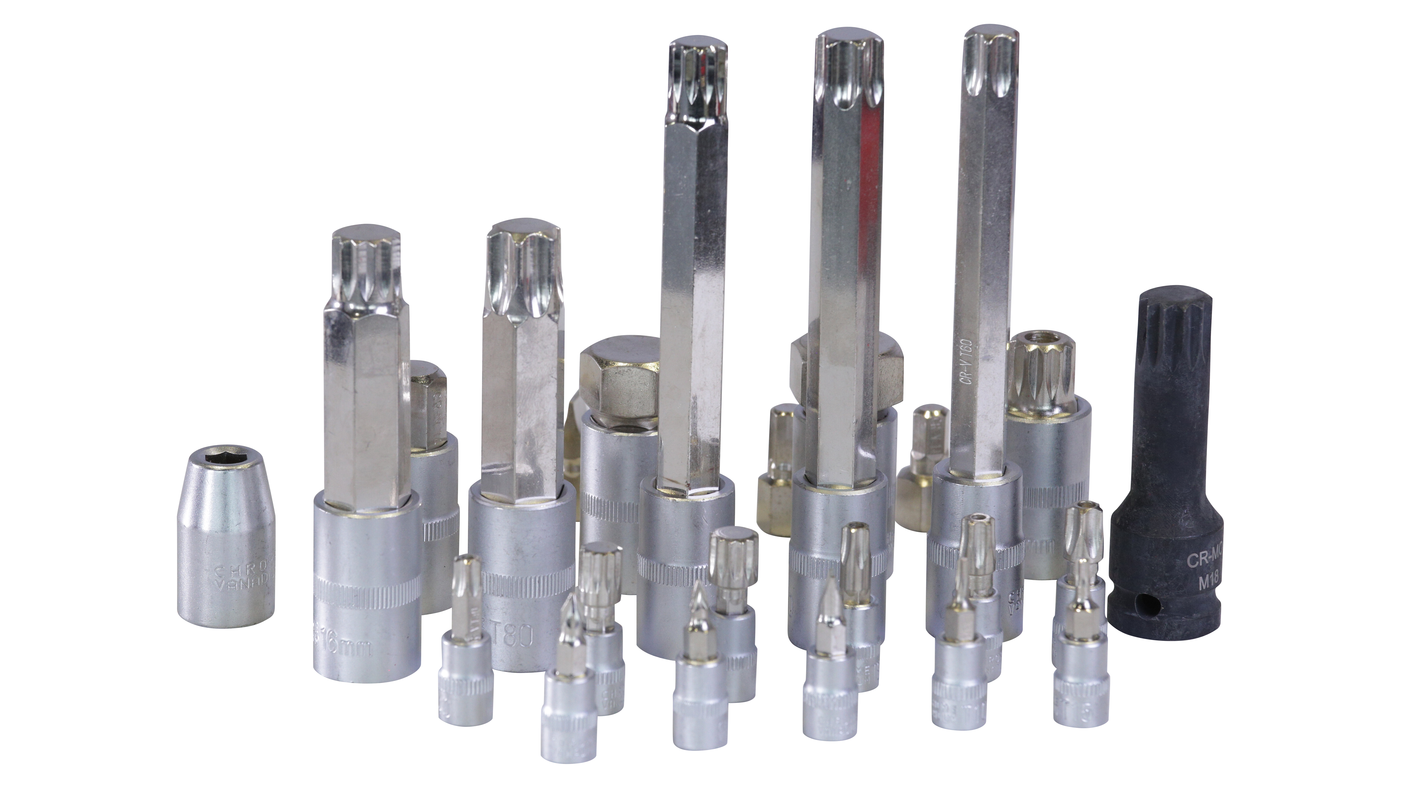 Головки-биты 1/2": MP7, MP8, MP9, MP10, M9, M10, M12, M14, M16, M16, T30, TT40, T45, T50, T55, T60, T70, T80, H5, H7, H10, H11, H13, H14, 17, H19, H22, 24