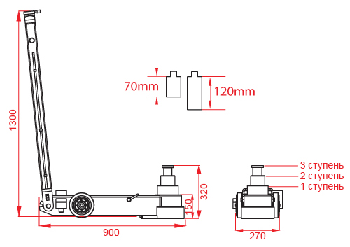 Описание: Домкрат пневмогидравлический трехступенчатый. Грузоподъемность 45/30/15 т.