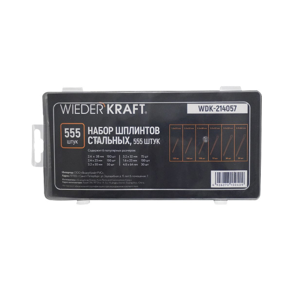WDK-214057 – набор из 555 стальных шплинтов содержит 6 популярных размеров , которые обеспечат надежную фиксацию деталей в различных механизмах. Удобный пластиковый кейс с перегородками обеспечивает надежное хранение и быстрый поиск нужного размера.