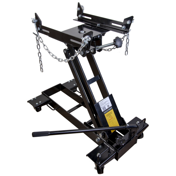 Регулируемая площадка оснащена захватами и цепями. Изделие снабжено 4 колесами для подката под кузов транспортного средства. Трансмиссионный домкрат способен удерживать до 1 тонны.