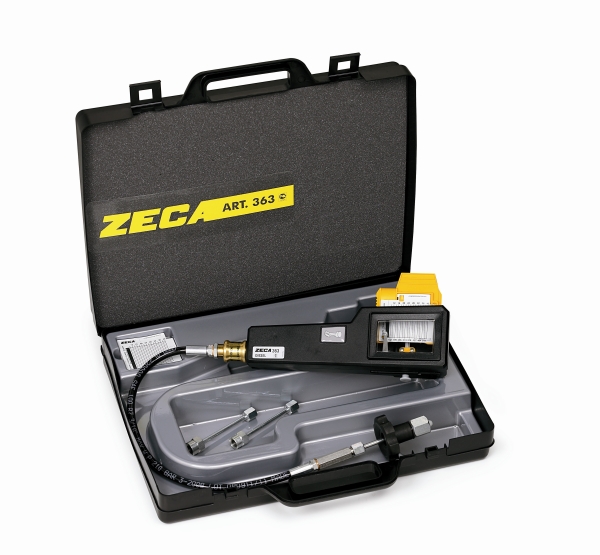 Компрессограф Zeca 363 используется для измерения и графической регистрации компрессии дизельных двигателей. Именно возможность графической регистрации выгодно отличает компрессограф от компрессометра. Благодаря наличию этой функции механик автосервиса может наглядно оценить работу каждого цилиндра автомобиля и показать результаты диагностики клиенту, а также дать рекомендации о необходимости проведения ремонта двигателя. Вся информация о величине компрессии отображается на специальных карточках, имеющих шкалу измерения от 8 до 40 бар. Общее количество измерений на одной карточке (максимальное количество цилиндров) составляет 8 (+2 дополнительно, без отображения номера измерения). Переключение на каждое последующее измерение производится вручную при помощи кнопки, расположенной на корпусе прибора. В стандартной комплектации компрессографа уже имеется комплект из 50 карточек, а в дальнейшем комплект карточек можно приобрести отдельно в любом количестве. Подключение компрессографа к двигателю производится при помощи быстрозатягивающегося адаптера на фальшфорсунки двигателей без необходимости использования гаечных ключей.