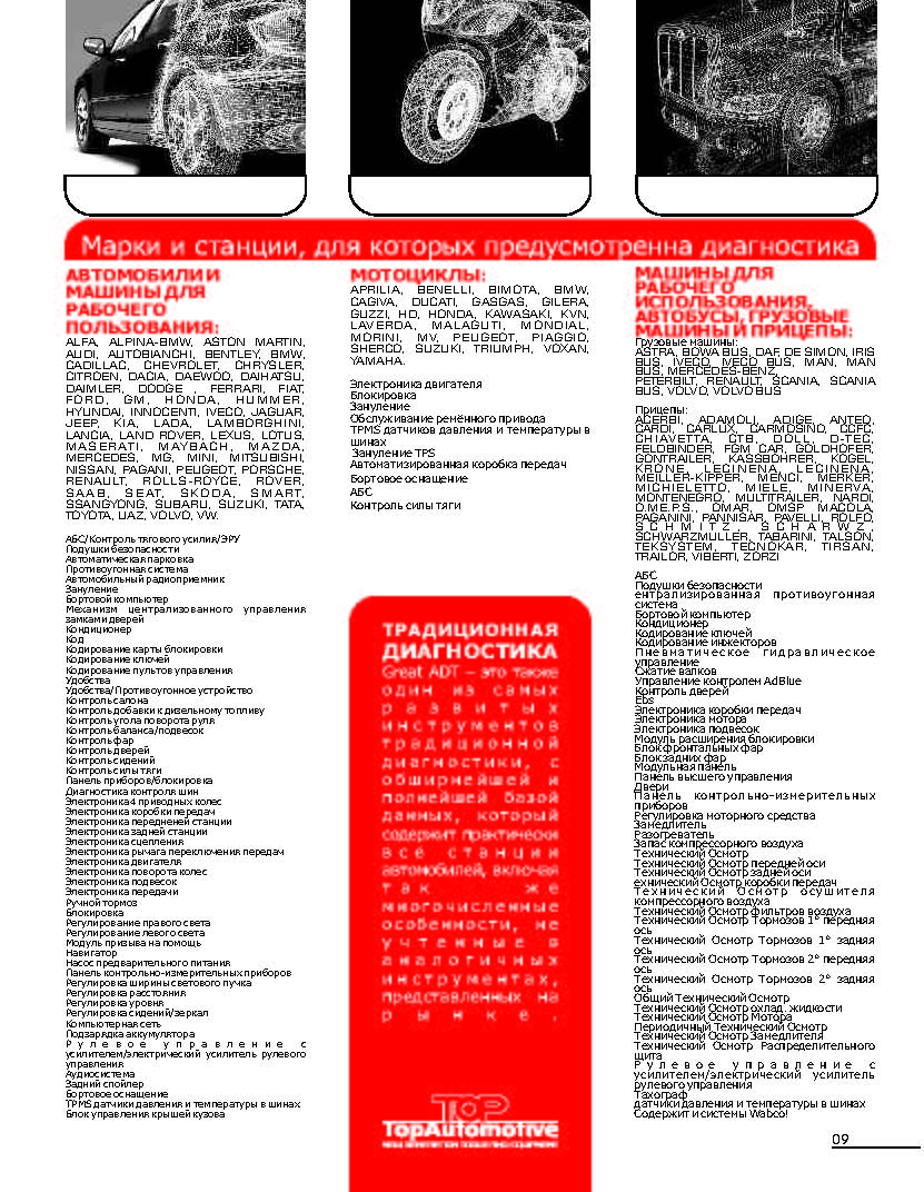 Кроме того система TOP System, встроенная в Great ADT позволяет утверждать, что с сегодняшнего дня диагностика доступна тем механикам, которые должны выполнить ряд работ с электрической системой автомобиля, не имея при этом особых навыков по работе со специальным диагностическим оборудованием. Механик лишь должен сделать выбор необходимой операции (техосмотр, замена тормозных колодок, регулировка подвески, удаление воздуха из гидросистем, перезапуск кондиционера и т.д.). Процессом выполнения операции будет полностью руководить TOP System, автоматически задействую необходимые подстанции. Выполнение операций происходит уверенно, точно, без риска ошибок. При такой методике полностью исключается потеря времени и риск повреждения автомобиля.