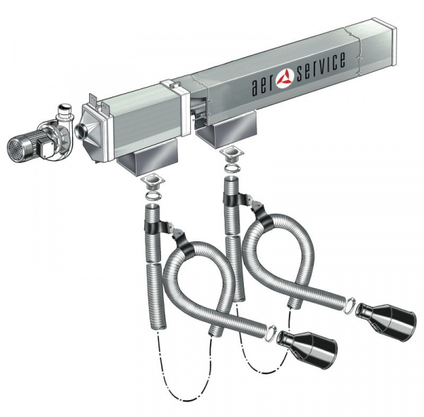 Рельсы сделаны из алюминиевого сплава, что гарантирует легкость конструкции и сопротивление воздействиям химических компонентов, содержавшим в выхлопном газе. Рельсы, с поддержкой заранее смонтированными кронштейнами из углеродистой стали, позволяет создание очень длинных всасывающих линий, стойких к скручиванию под нагрузкой. Система обеспечивает прекрасную внутреннюю вакуумную изоляцию, благодаря специальной резиновой изоляции стойкая к агрессивным компонентам выхлопного газа, высокой температуре, старению и трению. Установка конструкции очень упрощена с помощью большого диапазона телескопических кронштейнов, которые могут использоваться для установки также в на существенных высотах Рекомендуется исключительно для автомобильных сервисов в ситуациях, в которых система может быть одновременно использована на 2-х параллельно стоящих постах.
