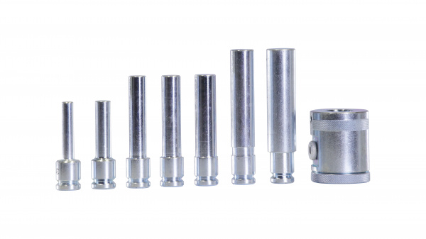 При работе с гидравлическим прессом часто возникают ситуации, когда необходимо выпрессовать или запрессовать деталь большего или меньшего диаметра, чем шток гидроцилиндра. Если в случае большего диаметра, все решается подбором оправы подходящего размера, то для работы с деталями меньшего размера оптимальными решением будет использование комплекта пуансонов различного диаметра.Комплект A-5600 состоит из 7 пуансонов диаметром 12, 16, 18, 20, 22, 25, 30 мм. Для фиксации пуансона в штоке гидроцилиндра, его достаточно просто вставить во внутреннюю полость штока, предварительно сняв защитную заглушку. За счет шарикового механизма пуансон надежно фиксируется и не выпадает в процессе эксплуатации. Для хранения комплекта, в конструкции прессов MEGA предусмотрена встроенная полка.