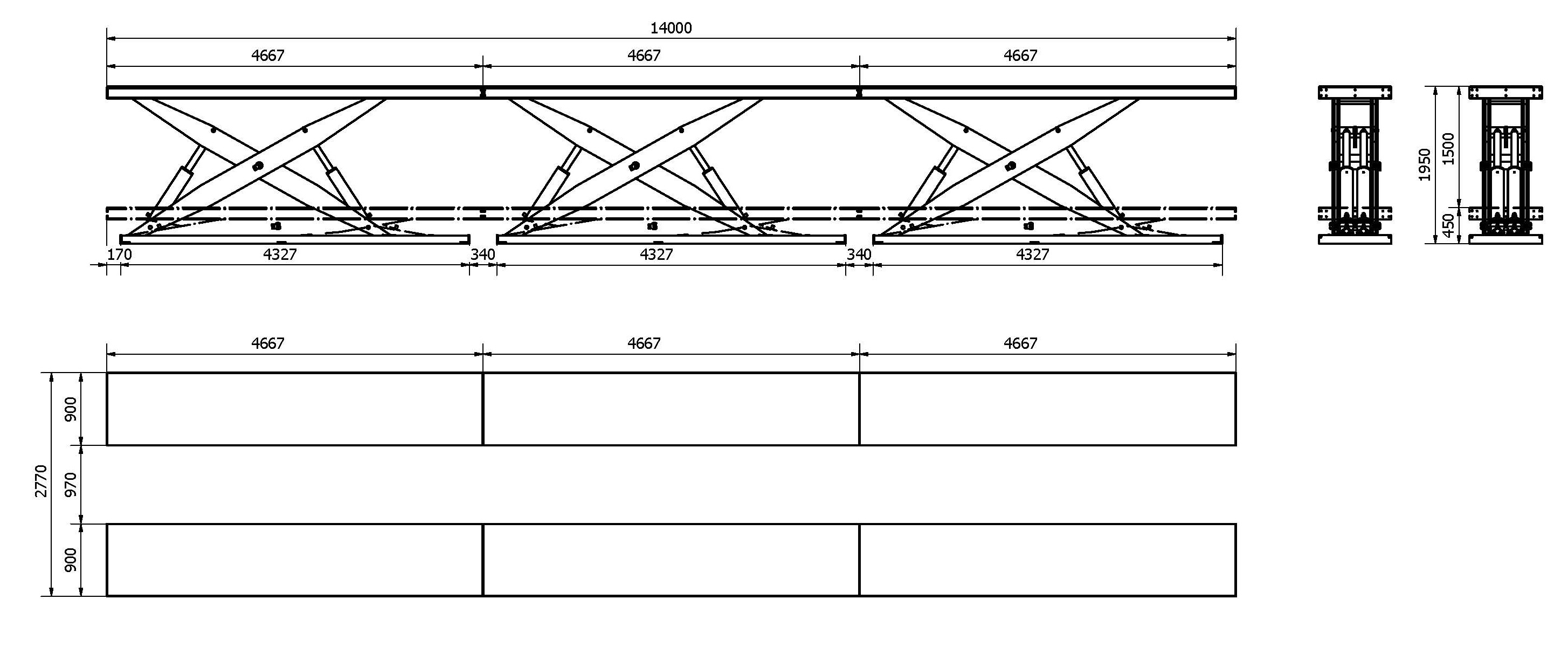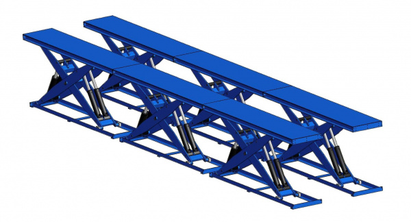 Описание: Подъемник ножничный, электрогидравлический, г/п 26000 кг., 15 кВт, 4-6 бар, высота подъема 1950 мм., размеры платформ 14000х900 мм, клиренс 450 мм., платформы - гладкие, синхронизация гидравлическая "master-slave".