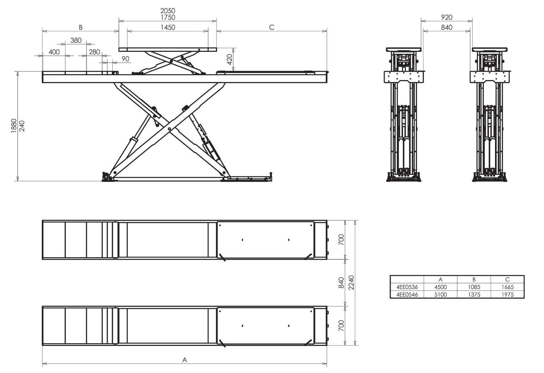 Описание: Подъемник ножничный, электрогидравлический, г/п 5500 кг., 2,2 кВт, высота подъема 1880 мм., размеры платформ 5100х700 мм, расстояние между платформами 800 мм, платформы гладкие