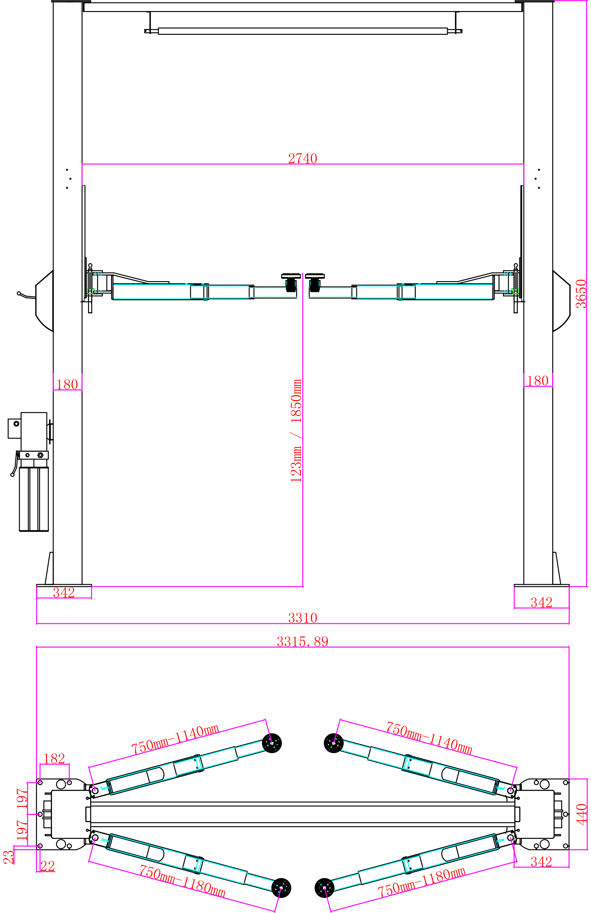 Грузоподъемность этого подъемника составляет 4000 кг. За подъем автомобиля отвечают два гидравлических цилиндра с цепным приводом каретки. Такой тип привода уменьшает нагрузку на гидроцилиндры и обеспечивает долговечность их работы. Каретки снабжены нейлоновыми ползунами, обеспечивающими плавное перемещение внутри стоек. Простая и, в тоже время, надежная система механических стопоров со снятием с одной стороны обеспечивает безопасное удержание автомобиля в поднятом состоянии на протяжении всего времени ремонта. Габаритная высота подъемника составляет 3650 мм и позволяет устанавливать его в помещениях с высотой потолка от 4 метров и выше.
