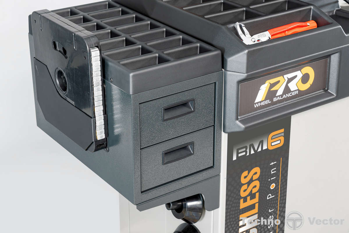 - Основная рабочая поверхность содержит более 29 универсальных ячеек для хранения балансировочных грузов и приспособлений.