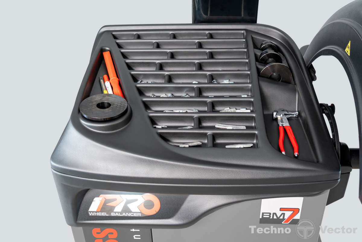 - Основная рабочая поверхность содержит более 30 универсальных ячеек для хранения балансировочных грузов, конусов и других приспособлений.