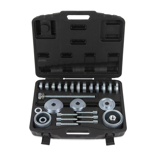 Набор инструментов для снятия подшипника ступицы колеса, который включает 31 предмет. Предназначен для разборки и сборки ступицы. Изделия произведены из высококачественной стали. Данный набор инструмента позволяет менять подшипники и/или сайлентблоки не снимая узел с автомобиля.Комплектация: