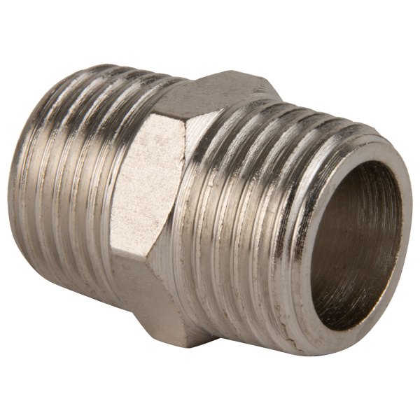 Стальной прямой переходник (соеденитель) с наружной резьбой 1/2"M - 1/2"M .Идеально подходит для соединения труб и шлангов в пневматических системах, обеспечивает надежное и герметичное соединение.