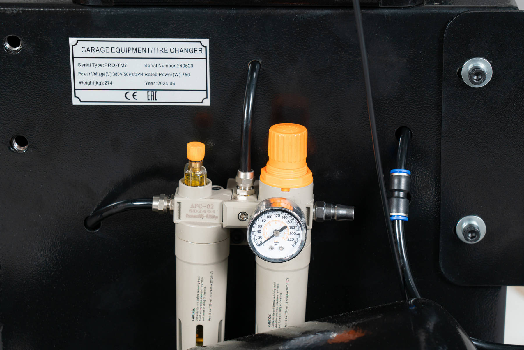 • Манометр контроля давления воздуха смонтирован на монтажной стойке. Накачка нажатием ногой на педаль.
